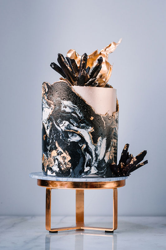 Techniques: Buttercream demonstration. Filling, stacking and covering a cake using buttercream. Marble Buttercream. Wafer Paper Decorations. Edible Crystals. Gold details.