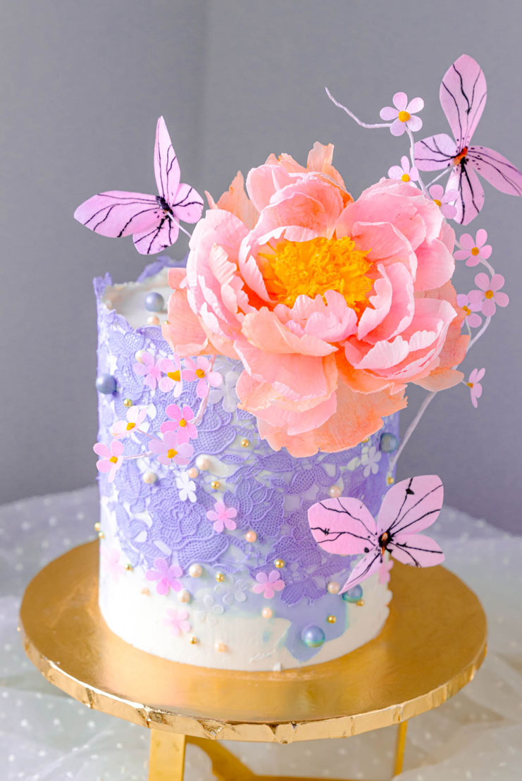 Save as PDFLevel: Intermediate Techniques: Filling, stacking and covering a 4 layer cake using white chocolate buttercream. Wafer paper Peony, filler flowers and butterflies. Edible lace.