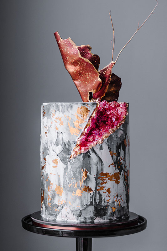 Techniques: Buttercream demonstration. Filling, stacking and covering a cake using buttercream. Buttercream effects. Edible crystals. Chocolate decorations. Gold details.