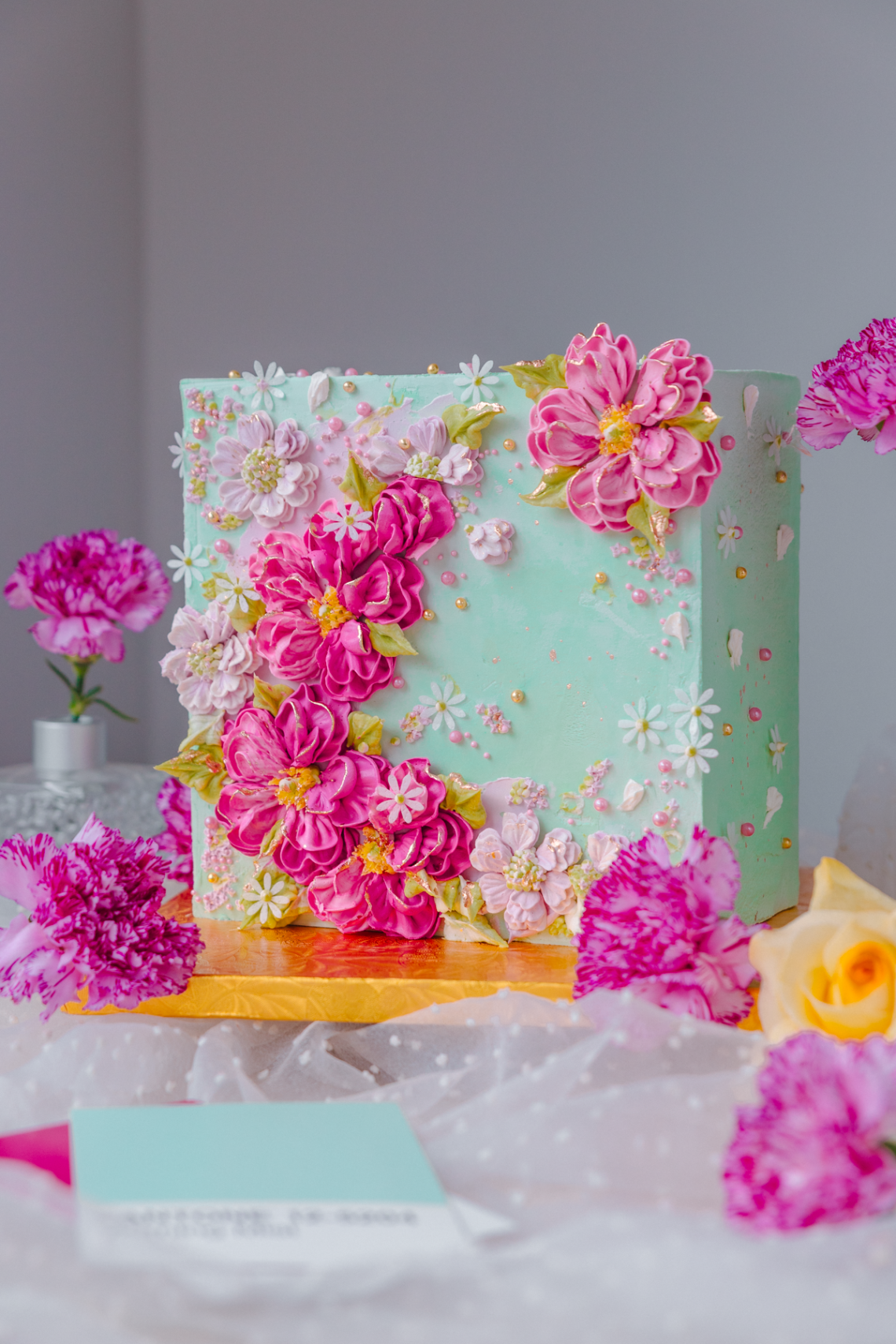Techniques: Filling, stacking and frosting a 2 layers real square cake using white chocolate buttercream. Introduction to buttercream flowers: Piping method, color palette and 2 different types of flowers plus leaves.