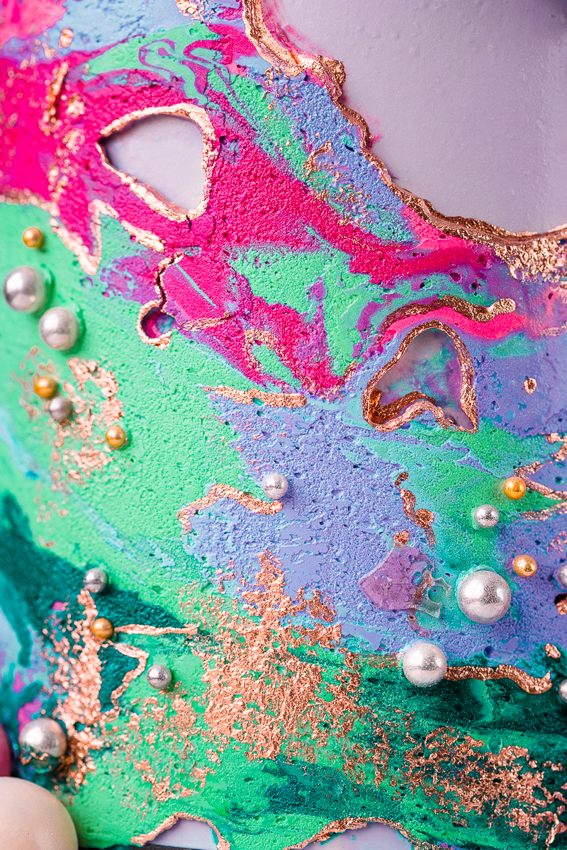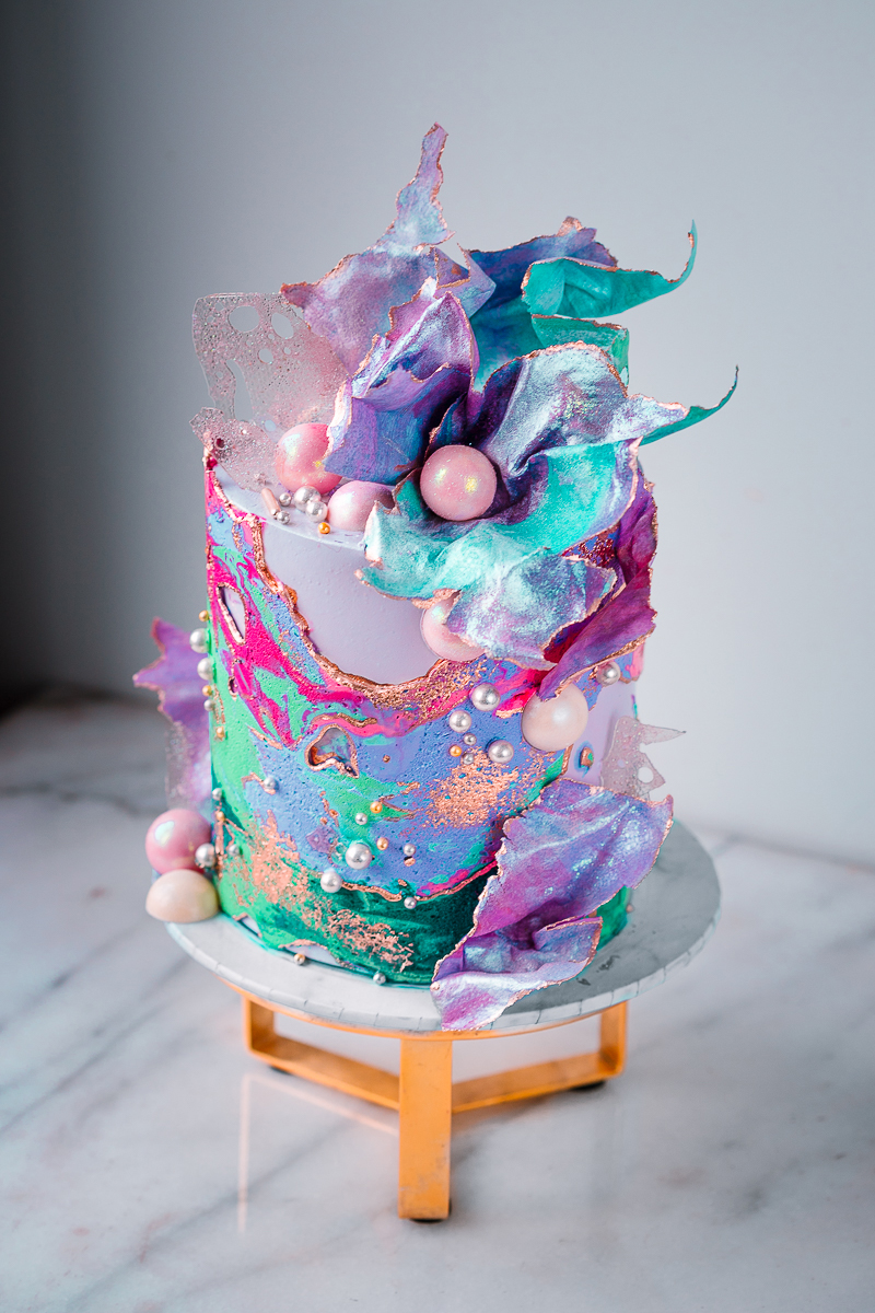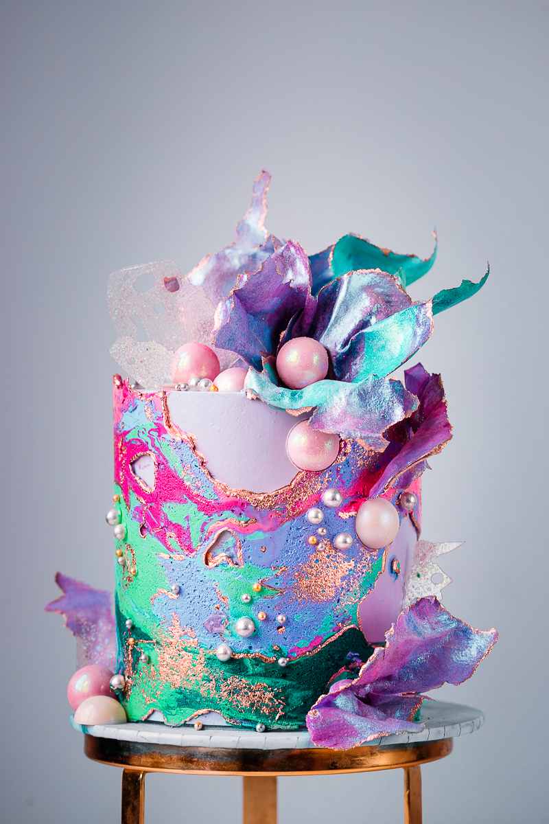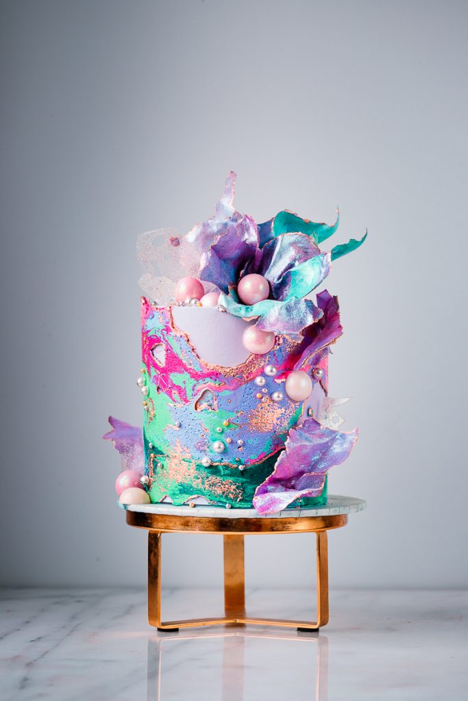 Level: Intermediate Techniques: Filling, stacking and covering a cake using buttercream. Marble buttercream. Marble texture on buttercream. Edible crystals. Gold