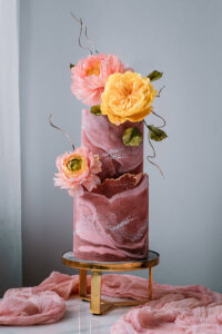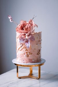 Level: Intermediate Techniques: Filling, stacking and covering a cake using buttercream. Marble Buttercream. Wafer Paper Rose. Gold details.