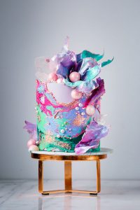 Level: Intermediate Techniques: Filling, stacking and covering a cake using buttercream. Marble Buttercream. Wafer Paper Decorations. Chocolate spheres. Isomalt corals. Gold details.