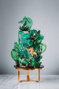 Level: Intermediate Techniques: Filling, stacking and covering a 6 layer cake using buttercream. Emerald Marble. Rice paper sails. Isomalt crystals. Gold details.