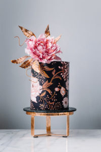 Level: Intermediate Techniques: Filling, stacking and covering a cake using buttercream. Edible prints. Wafer paper peony. Wafer paper leaves. Gold details.