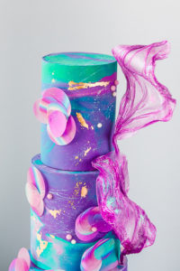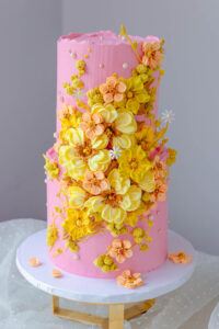 Level: Intermediate Techniques: Buttercream demonstration. Filling, stacking and covering a cake using buttercream. Marble Buttercream. Wafer Paper Decorations. Gold details.