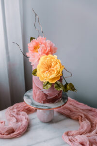 Level: Intermediate - 1 day prep Techniques: Filling and stacking a 3 layers real cake using white chocolate buttercream. Introduction to buttercream flowers: Piping method, color palette and 2 different types of flowers: Rose, Peony plus leaves. Wafer paper details and petals. Optional: Only dummy cake.