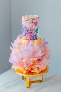 Level: Intermediate Techniques: Filling and stacking a real cake using white chocolate buttercream. Covering a cake with wafer paper ruffles and edible shugar sheet. The middle gold cake is fake and covered in fake gold leaf.