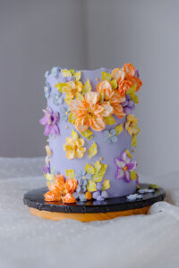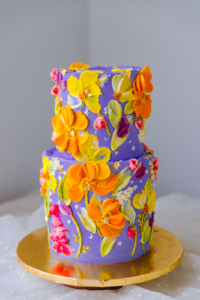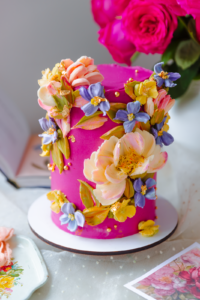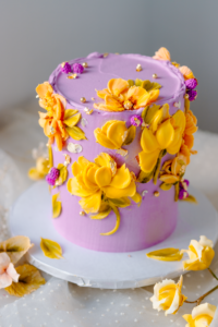 Level: Intermediate - 1 day prep Techniques: Filling and stacking a 3 layers real cake using white chocolate buttercream. Introduction to buttercream flowers: Piping method, color palette and 3 different types of flowers plus leaves. Option 1: Only dummy cake. Option 2: Bottom cake, real. Top cake dummy.