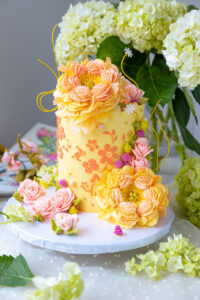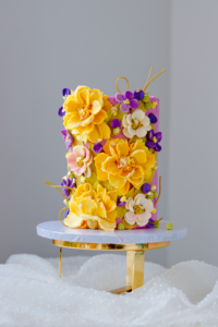 Level: Intermediate - 1 day prep Techniques: Introduction to 3D buttercream flowers: Piping method, color palette and 4 different types of flowers: Rose, David Austin Rose, Calla lily and wild daisies. Plus berries, leaves, edible branches and Wafer paper sweet pea .