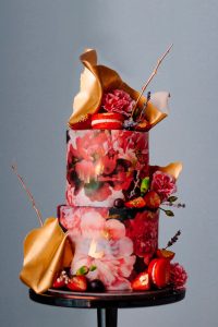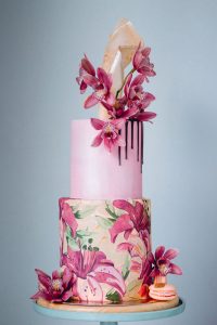 Level: Intermediate Techniques: Buttercream demonstration. Filling, stacking and covering a 2 tiered cake using buttercream. Covering with sugar paper. Chocolate decorations. Chocolate drips. Real flowers. Gold details.