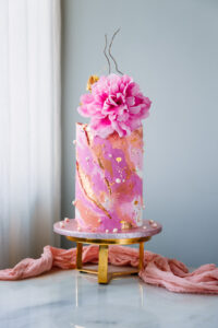 Level: Intermediate Techniques: Filling, stacking and covering a 6 layer cake using buttercream. Watercolor and gold cracks. Wafer paper Peony and leaves.