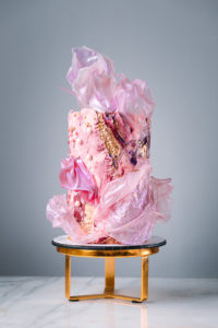 Level: Intermediate Techniques: Filling, stacking and covering a 6 layer cake using buttercream. Rose Stone. Rice paper sails. Gold details.