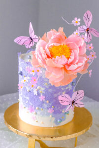 Level: Intermediate Techniques: Filling, stacking and covering a 4 layer cake using white chocolate buttercream. Wafer paper Peony, filler flowers and butterflies. Edible lace.