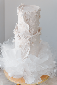 Level: Intermediate Techniques: Filling and stacking a real cake using dark chocolate ganache. Stacking real and fake cakes. Covering a cake with fondant and bas-relief details. Small gumpaste flowers, Wafer Paper ruffles and veils.