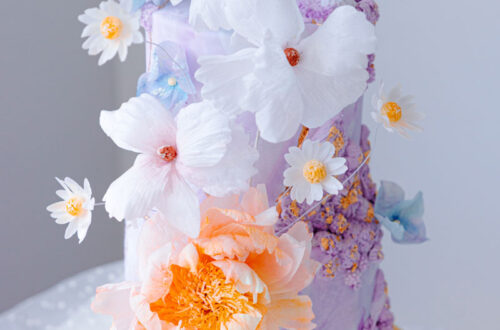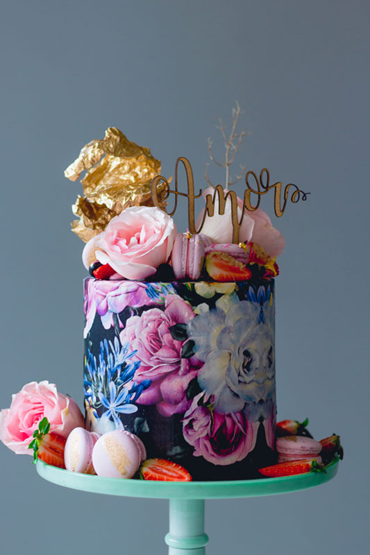 Designs Sugar paper floral print May 11, 2019 / Save as PDF Level: Basic Techniques: Buttercream demonstration. Filling, stacking and covering a cake using buttercream. using sugar paper. Chocolate decorations. Real flowers. Gold details.