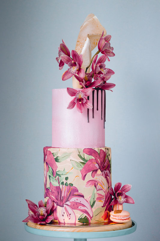 Designs Two tiered Pink flowers May 11, 2019 / Save as PDF Level: Intermediate Techniques: Buttercream demonstration. Filling, stacking and covering a 2 tiered cake using buttercream. Covering with sugar paper. Chocolate decorations. Chocolate drips. Real flowers. Gold details.